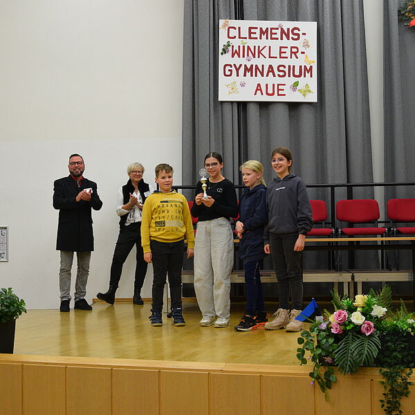 Um 17:30 Uhr stieg die Spannung. Alle Wettbewerbsteilnehmer fanden sich in der Aula zur Siegerehrung ein. Als Sieger durften sich eigentlich alle Beteiligten fühlen. Den Pokal konnten voller Stolz die Kinder der Evangelischen Grundschule Schneeberg mitnehmen.