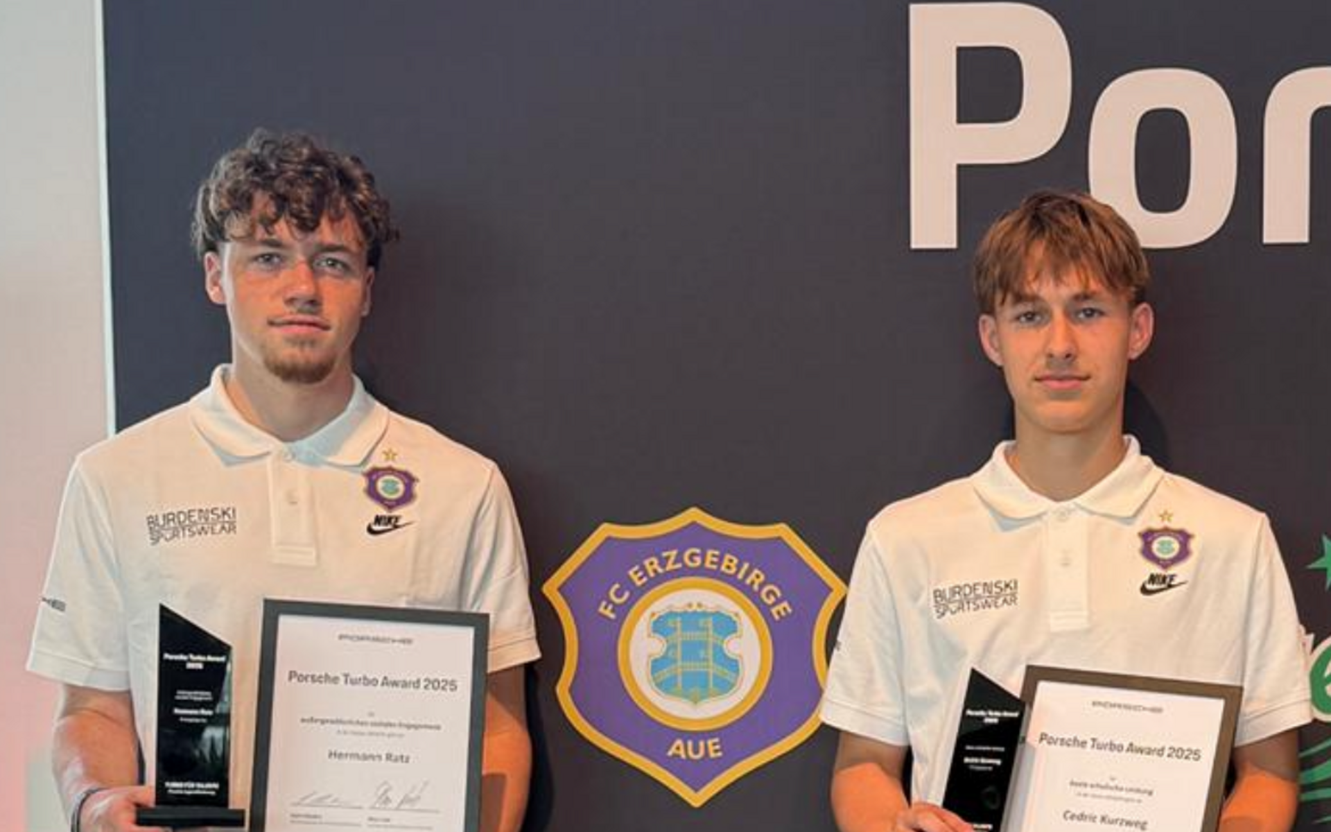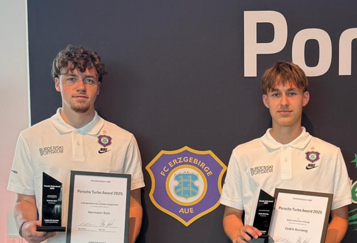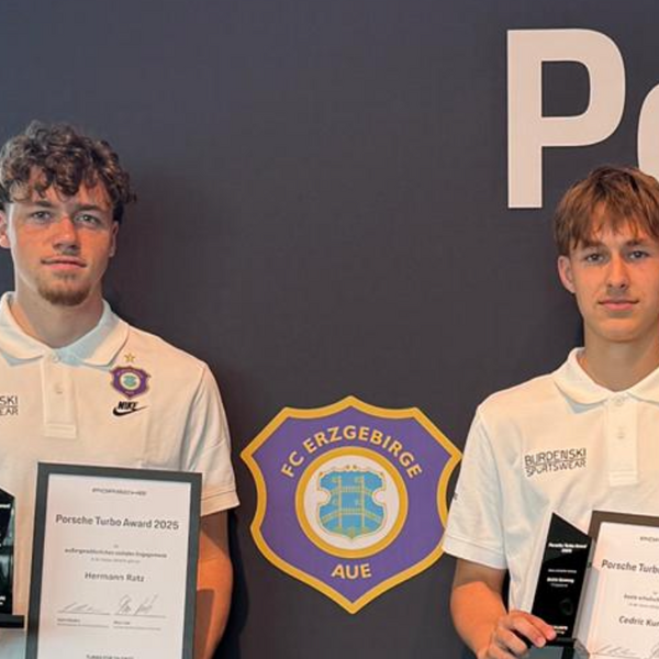 Am Mittwoch, dem 28. Mai 2025, wurden zwei Schüler unserer Schule im Rahmen des „Porsche Turbo Award 2025“ im Porsche Museum in Stuttgart für ihre besonderen Leistungen ausgezeichnet: Cedric Kurzweg (Klasse 10s) und Hermann Ratz (Klasse 11) gehören zu den diesjährigen Preisträgern aus dem Nachwuchsbereich des FC Erzgebirge Aue.